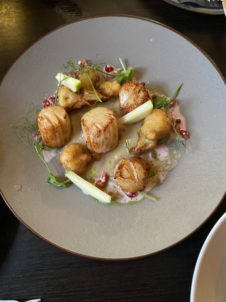 The pork belly with scallops was amazing. Braised beef Scottish slab was very tender. Sticky toffee pudding also very good.